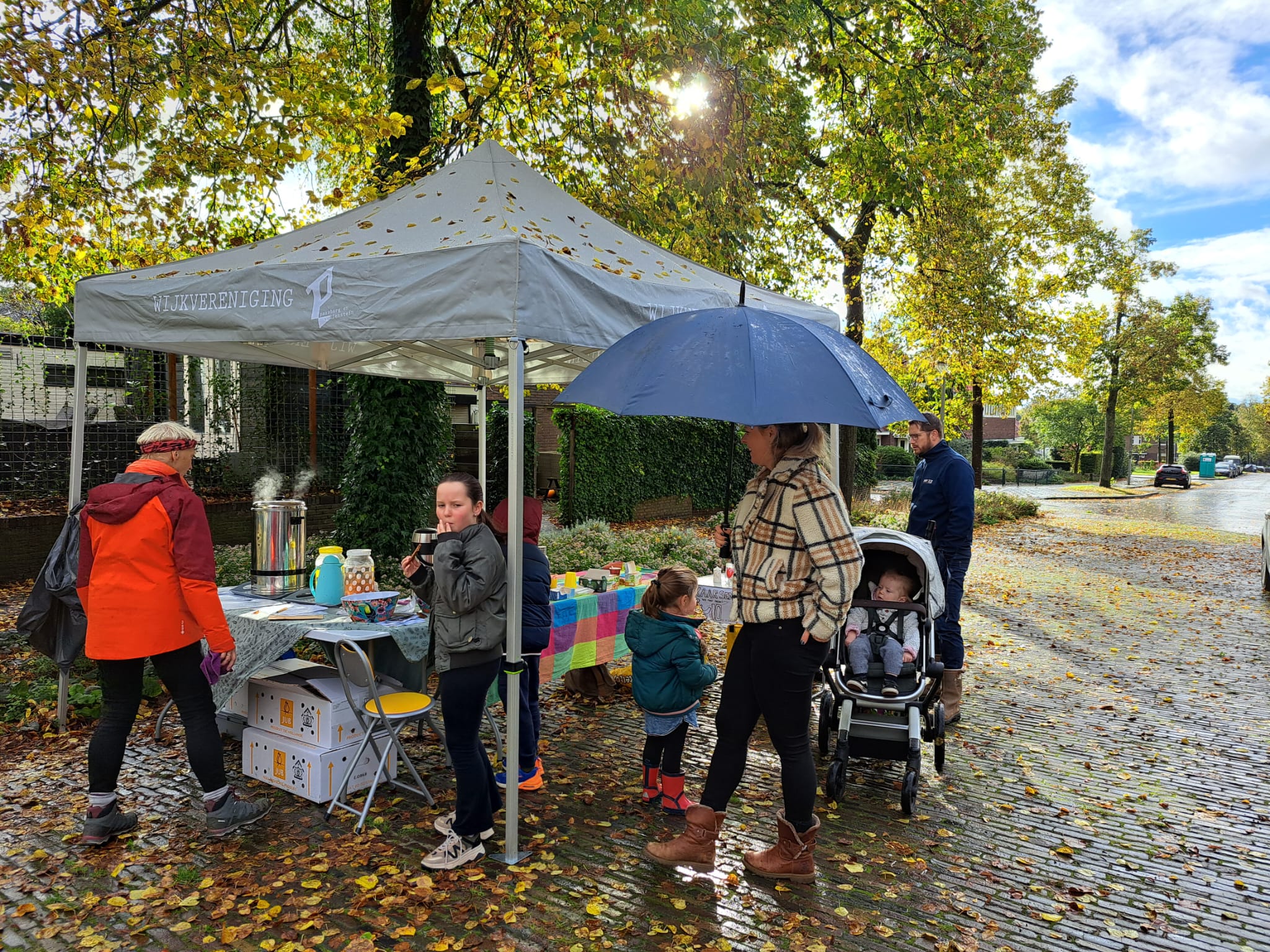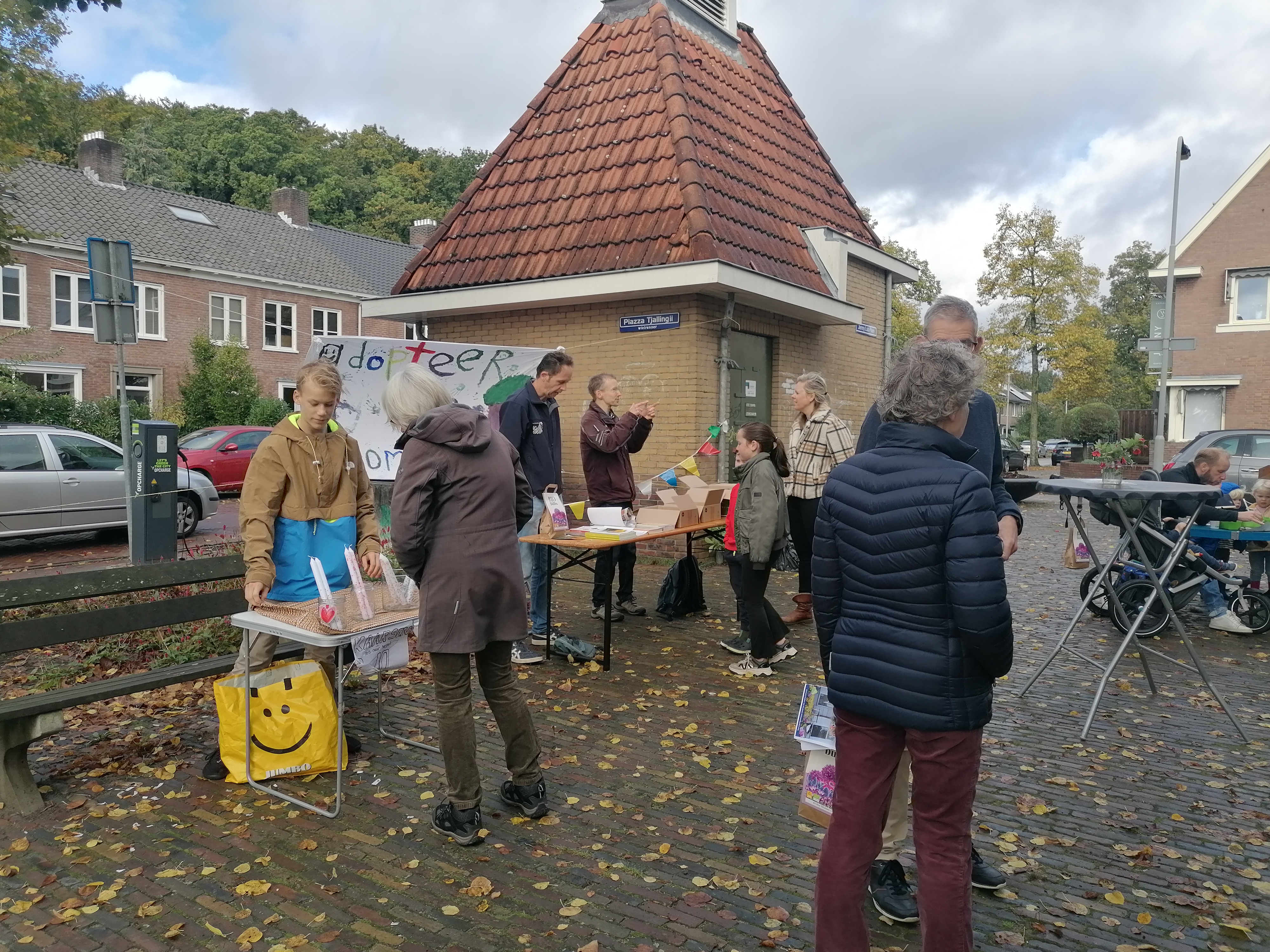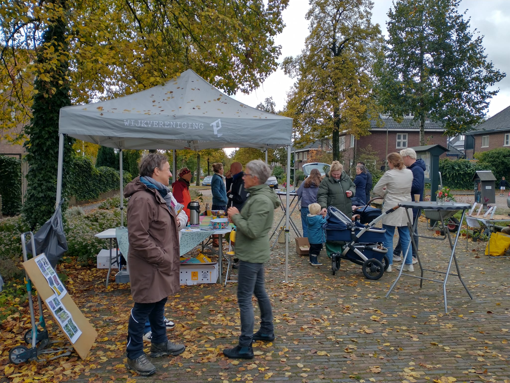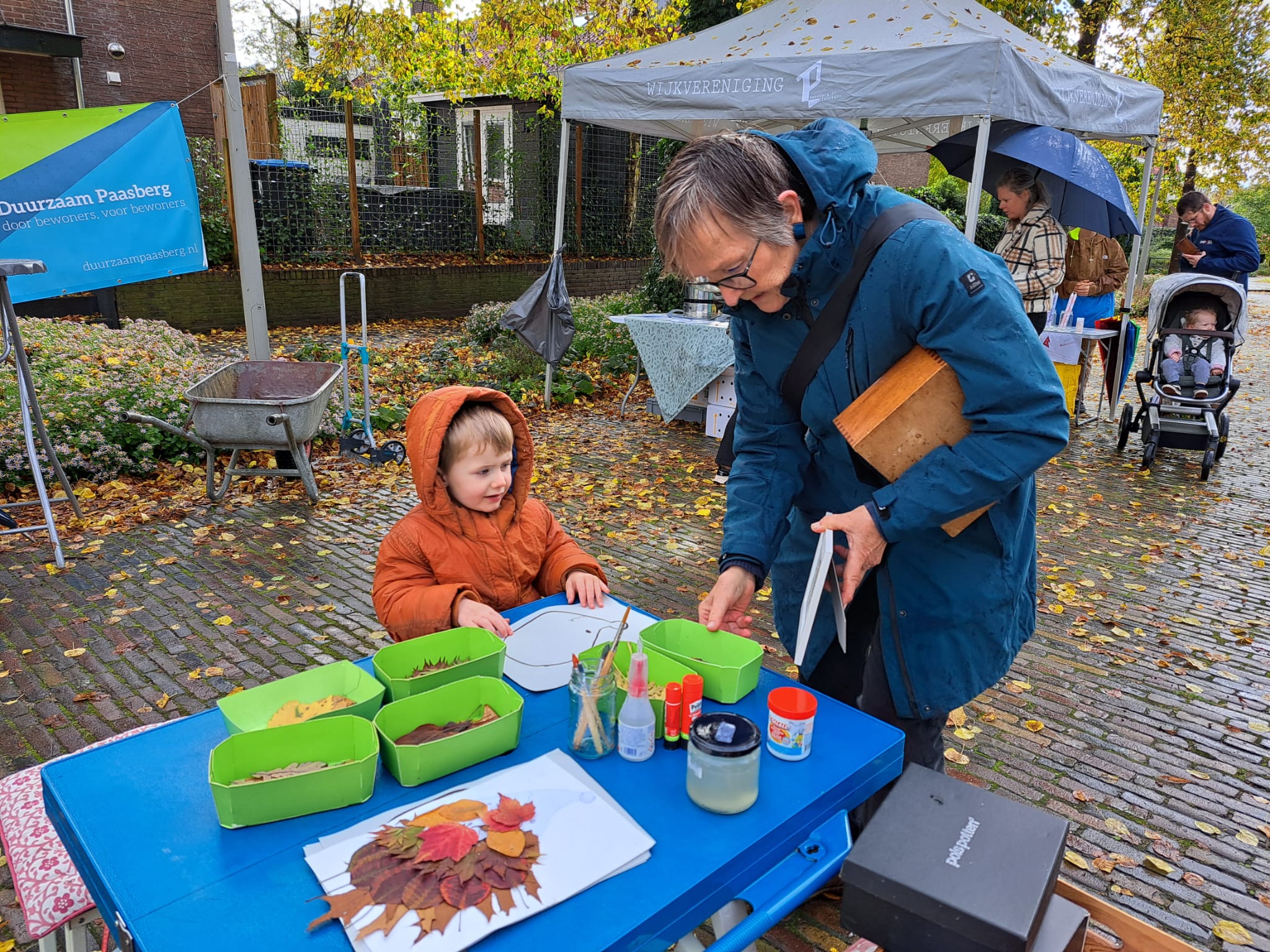 21-10-2023 - Bijna 30 wijkbewoners hebben zich tijdens de herfstmarkt opgegeven om een boomspiegel te adopteren in de wijk. Een groot succes om onze wijk nog mooier en groener te maken. Ze kregen een zakje bloembollen en kunnen gratis compost krijgen via de gemeente. De herfstmarkt op zaterdag 21 oktober begon wat aarzelend. Het eerste half uur was er door de regen bijna geen aanloop maar in de loop van de ochtend kwamen toch nog aardig wat wijkbewoners langs en lieten zich informeren door Duurzaam Paasberg, Paasberg zoemt en de Vogelwerkgroep Arnhem. En natuurlijk plantjes ruilen en kopen. Maar vooral was het erg gezellig bijpraten met een kopje koffie en de kinderen konden met herfstbladeren een egel maken.
