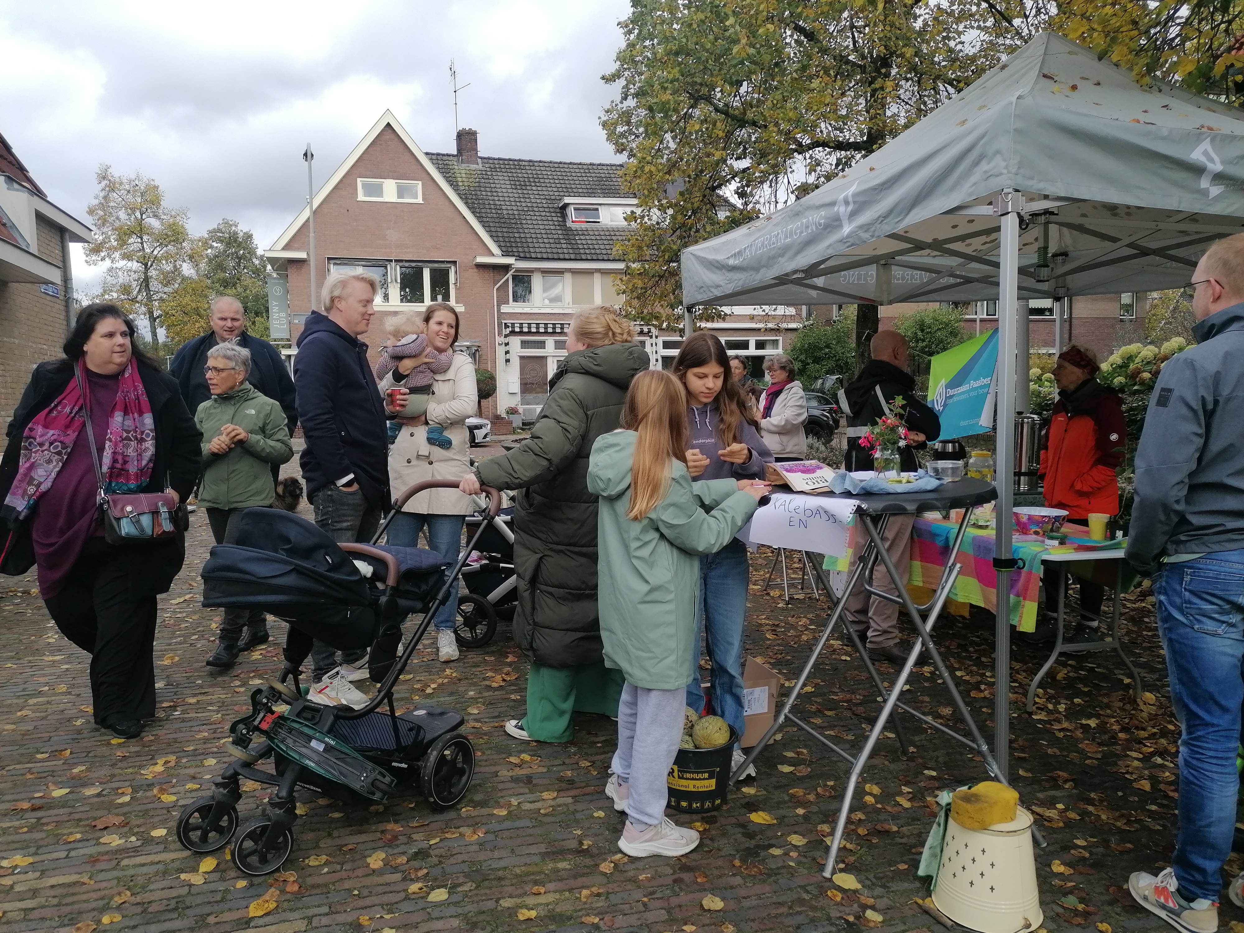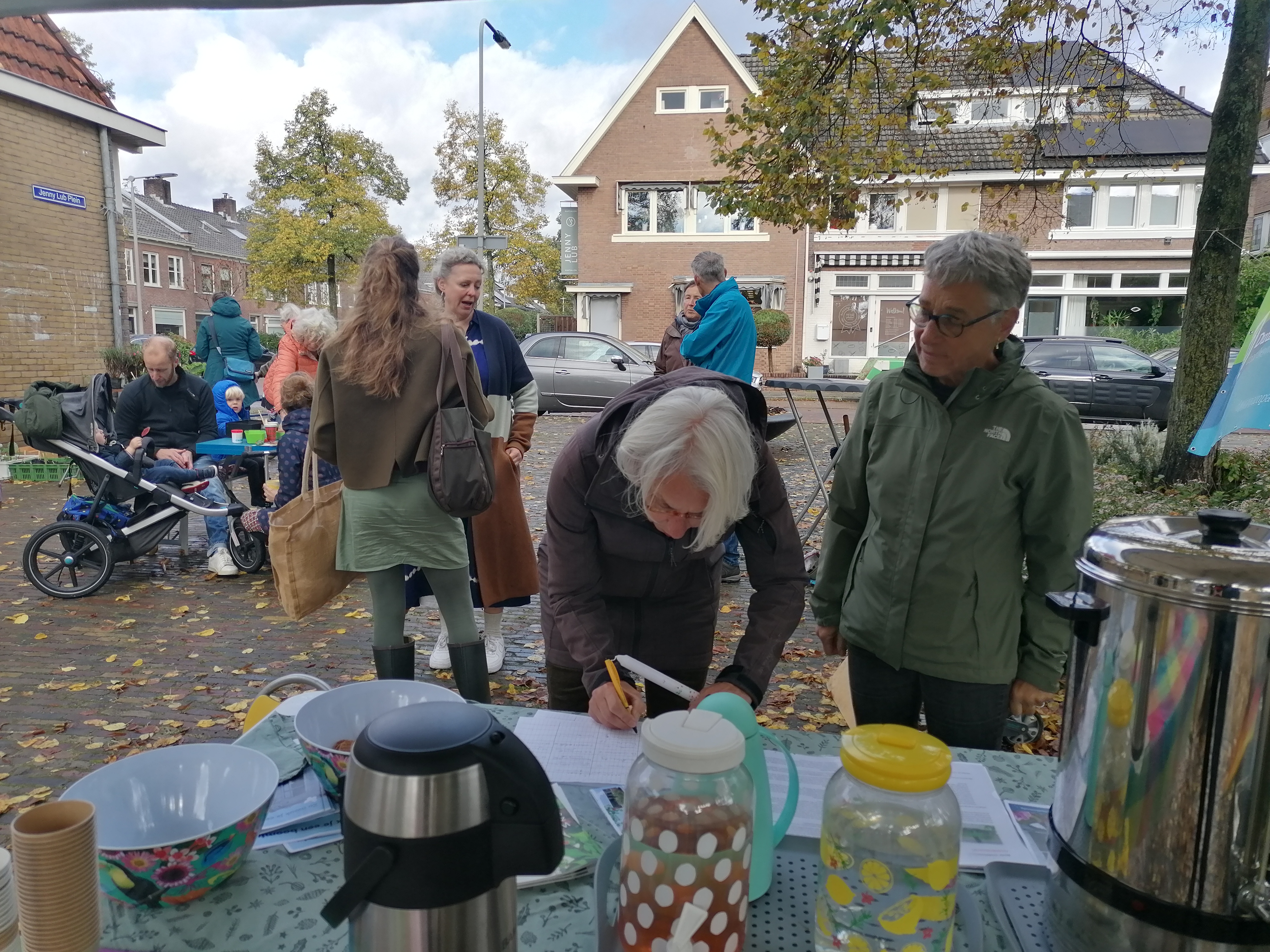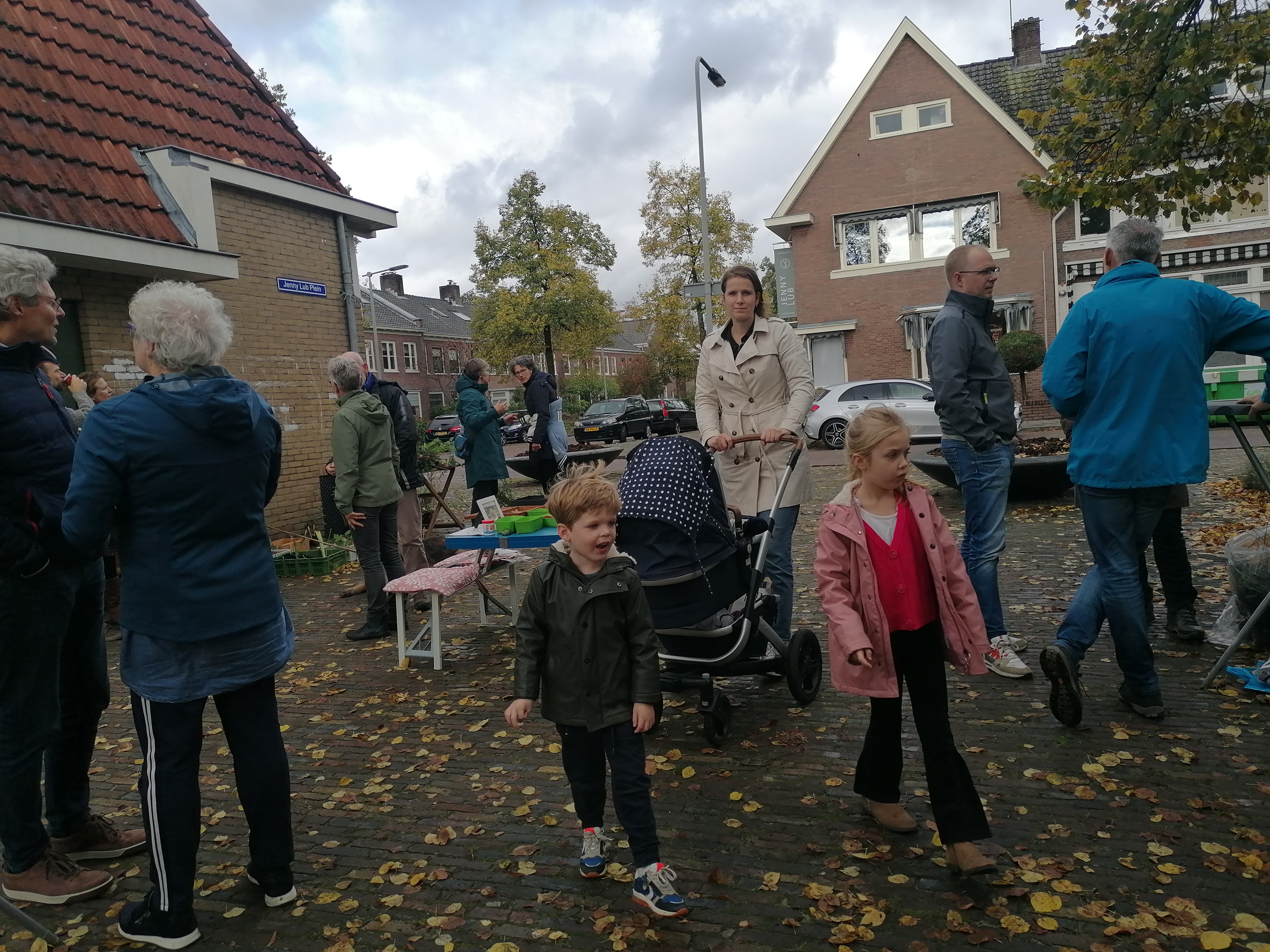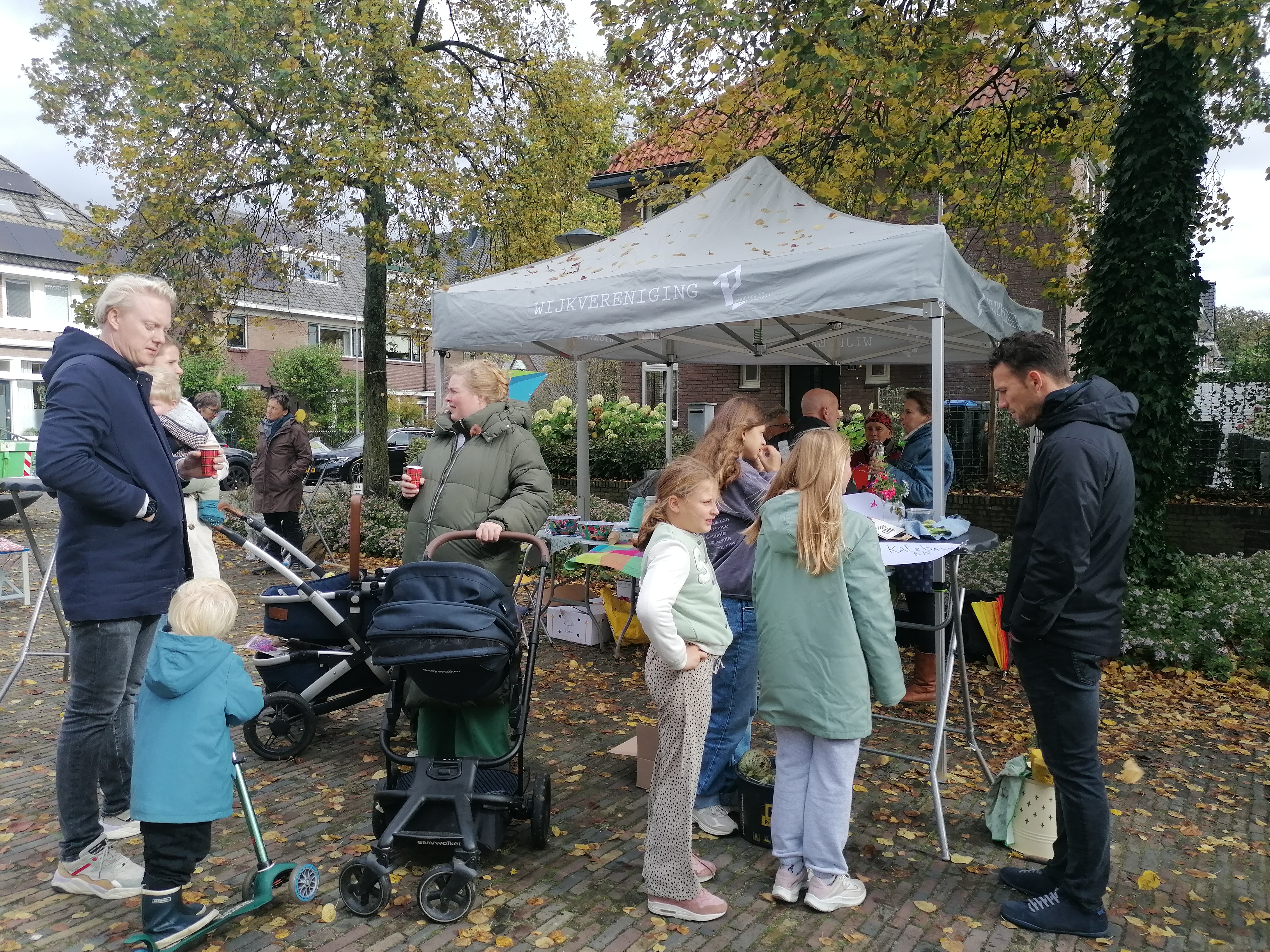 21-10-2023 - Bijna 30 wijkbewoners hebben zich tijdens de herfstmarkt opgegeven om een boomspiegel te adopteren in de wijk. Een groot succes om onze wijk nog mooier en groener te maken. Ze kregen een zakje bloembollen en kunnen gratis compost krijgen via de gemeente. De herfstmarkt op zaterdag 21 oktober begon wat aarzelend. Het eerste half uur was er door de regen bijna geen aanloop maar in de loop van de ochtend kwamen toch nog aardig wat wijkbewoners langs en lieten zich informeren door Duurzaam Paasberg, Paasberg zoemt en de Vogelwerkgroep Arnhem. En natuurlijk plantjes ruilen en kopen. Maar vooral was het erg gezellig bijpraten met een kopje koffie en de kinderen konden met herfstbladeren een egel maken.
