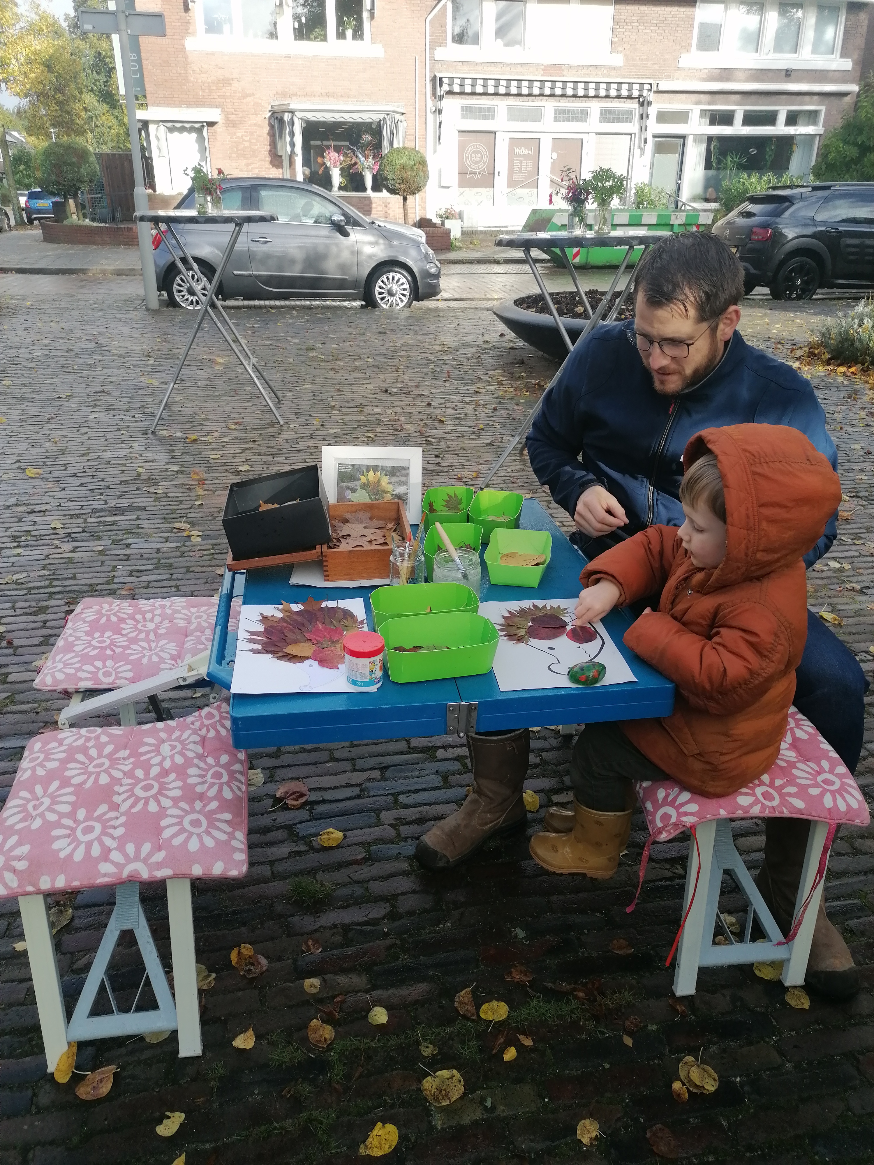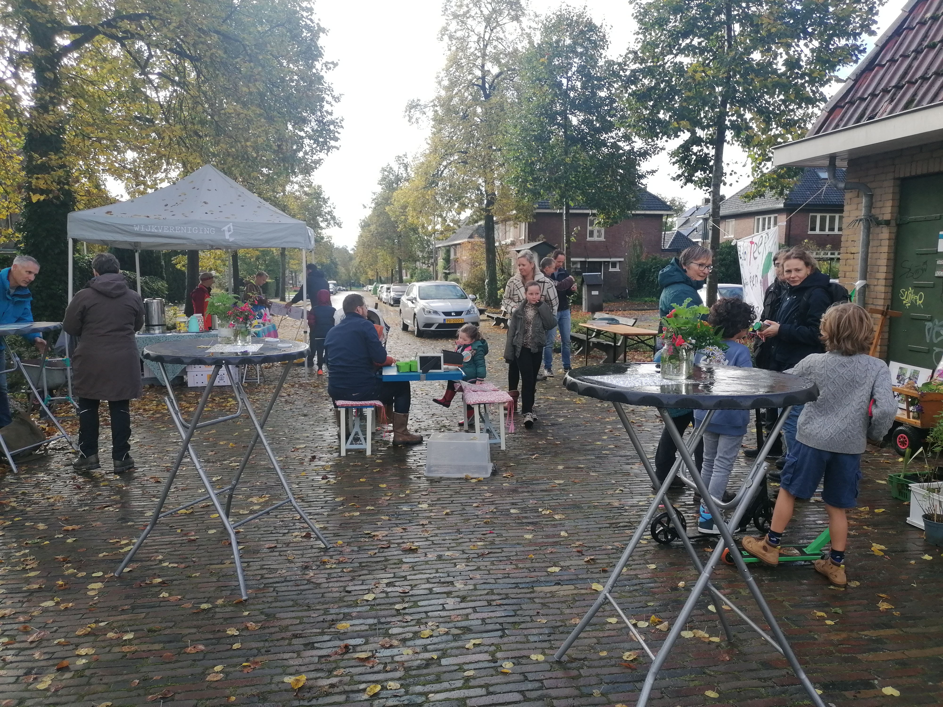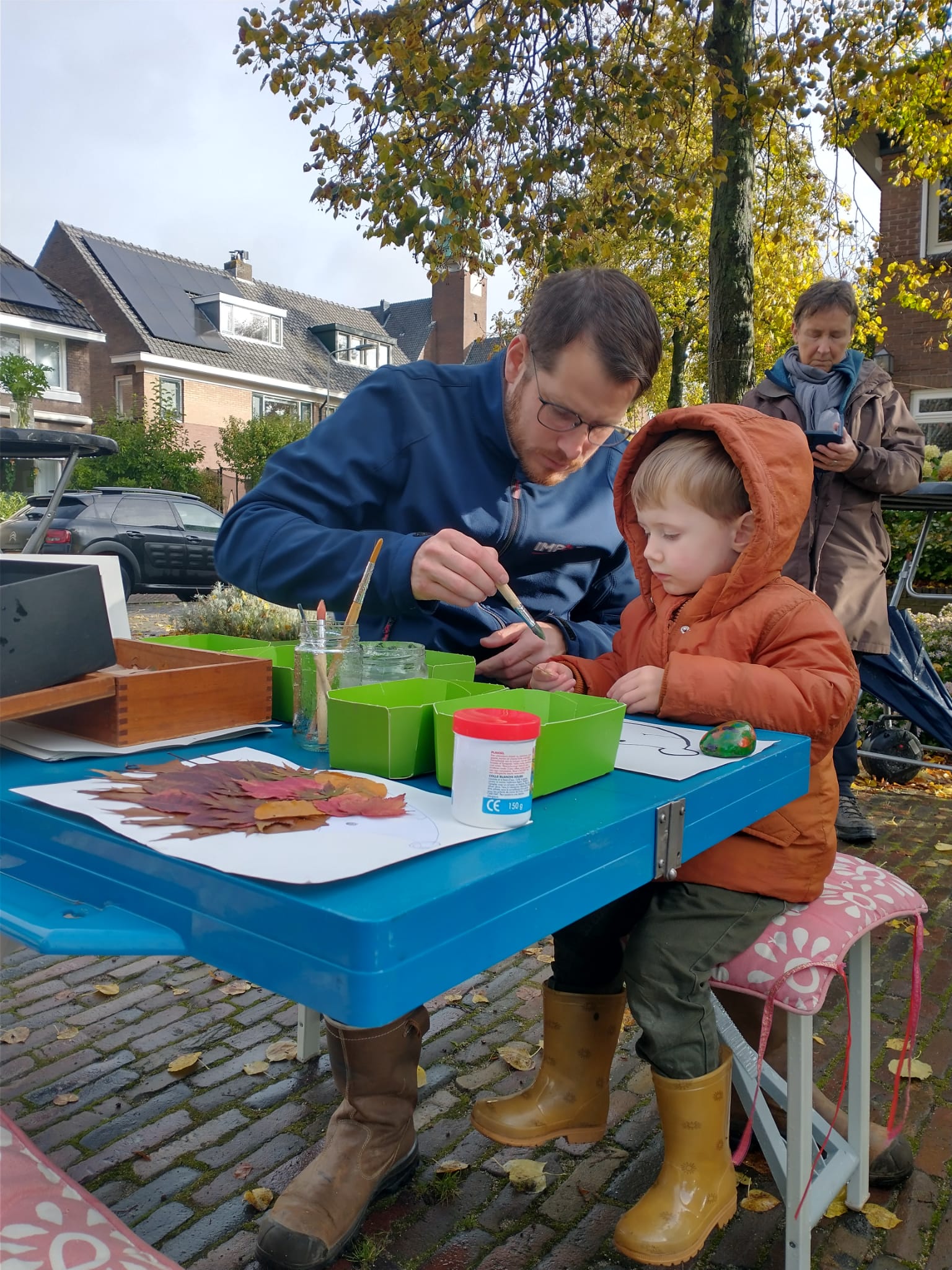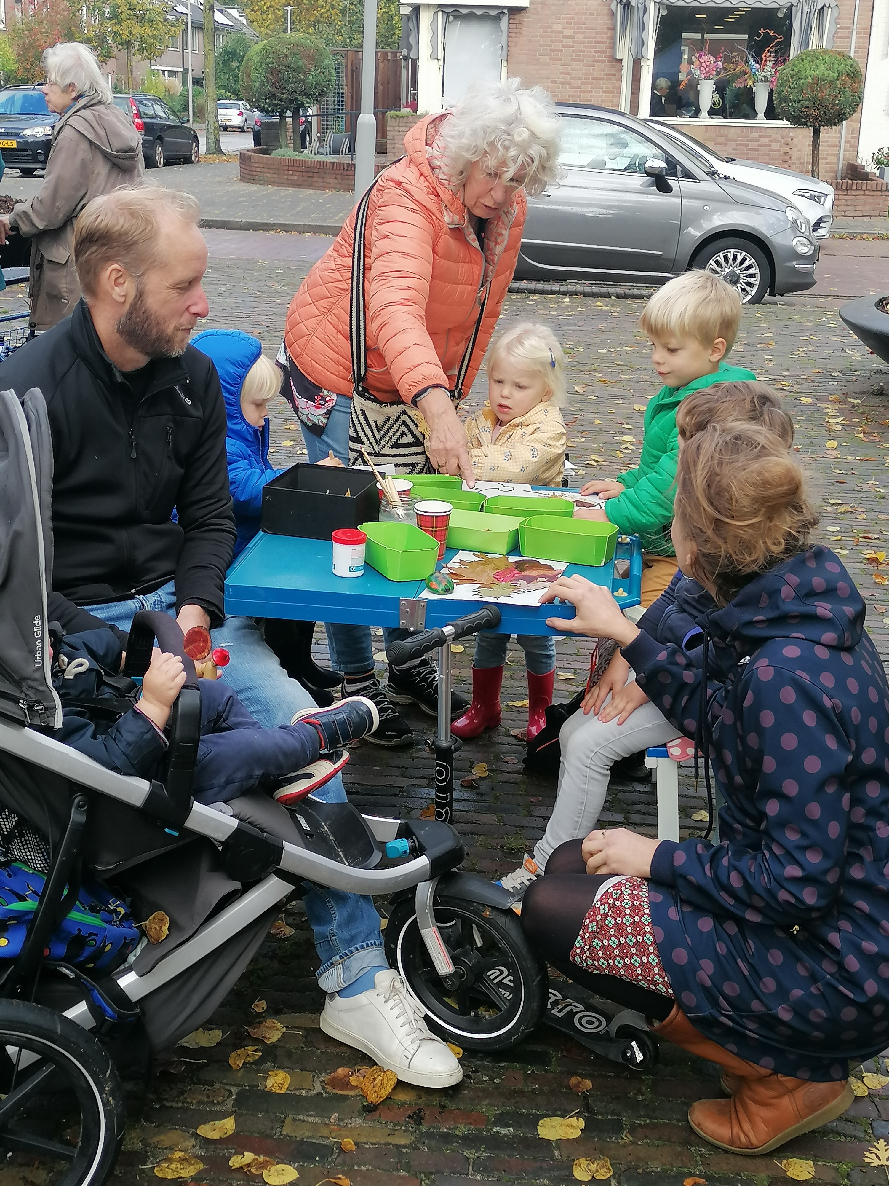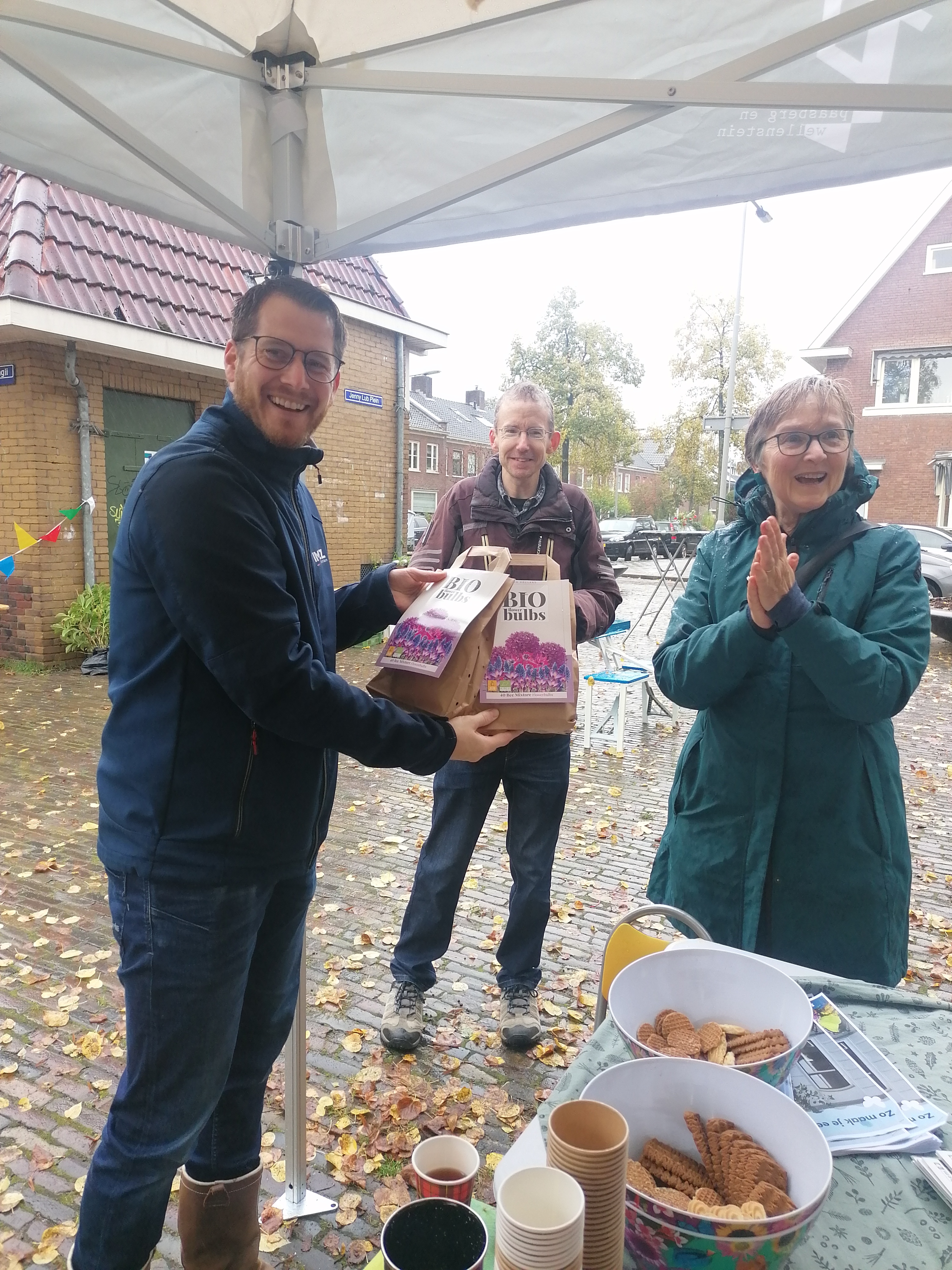 21-10-2023 - Bijna 30 wijkbewoners hebben zich tijdens de herfstmarkt opgegeven om een boomspiegel te adopteren in de wijk. Een groot succes om onze wijk nog mooier en groener te maken. Ze kregen een zakje bloembollen en kunnen gratis compost krijgen via de gemeente. De herfstmarkt op zaterdag 21 oktober begon wat aarzelend. Het eerste half uur was er door de regen bijna geen aanloop maar in de loop van de ochtend kwamen toch nog aardig wat wijkbewoners langs en lieten zich informeren door Duurzaam Paasberg, Paasberg zoemt en de Vogelwerkgroep Arnhem. En natuurlijk plantjes ruilen en kopen. Maar vooral was het erg gezellig bijpraten met een kopje koffie en de kinderen konden met herfstbladeren een egel maken.