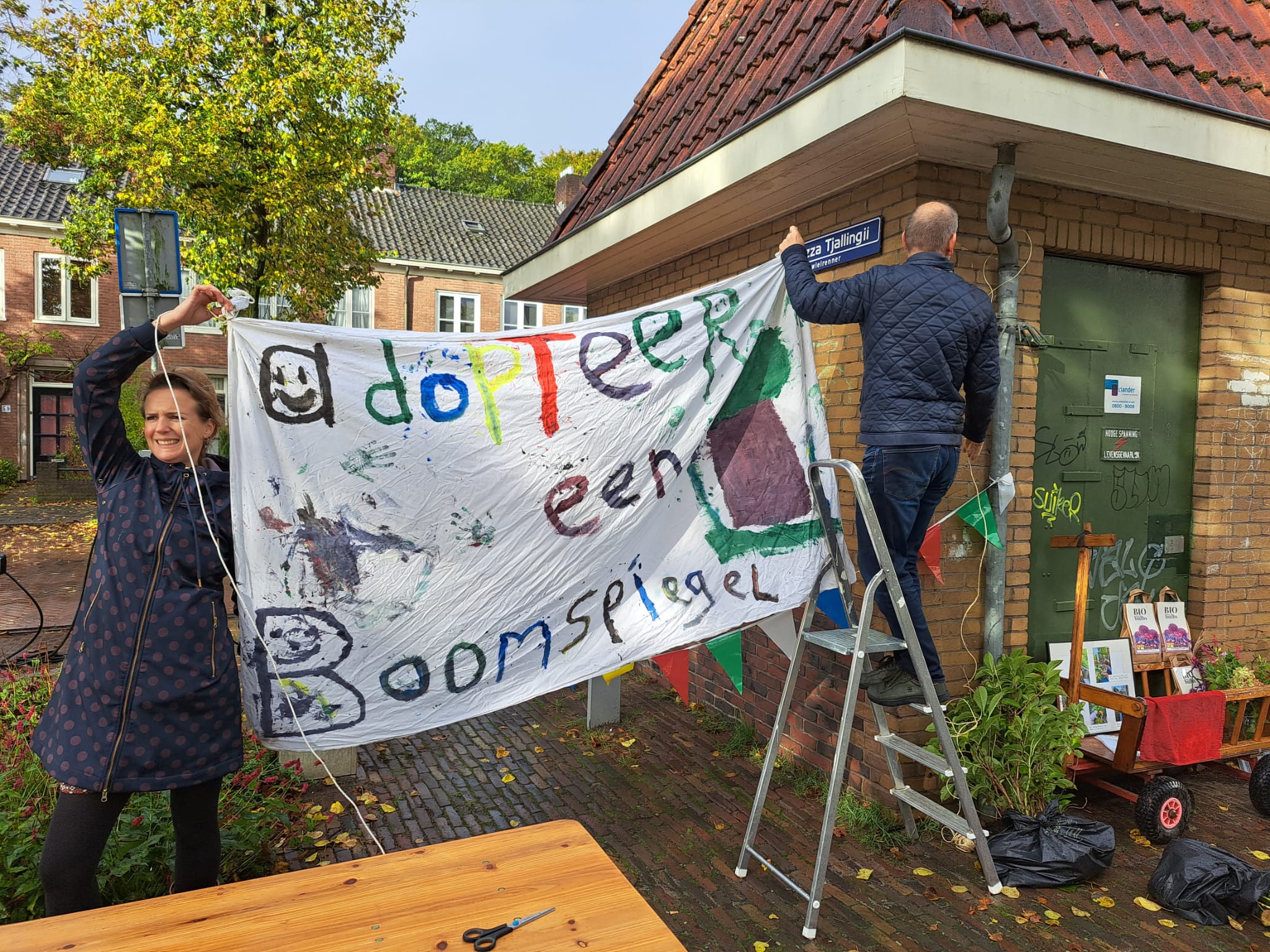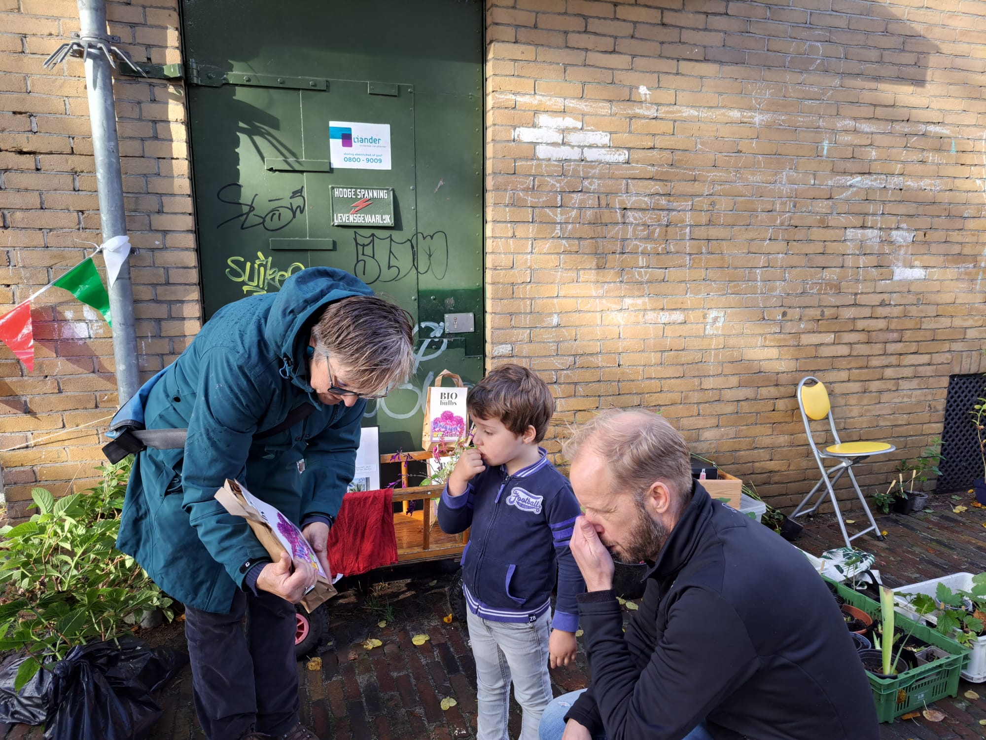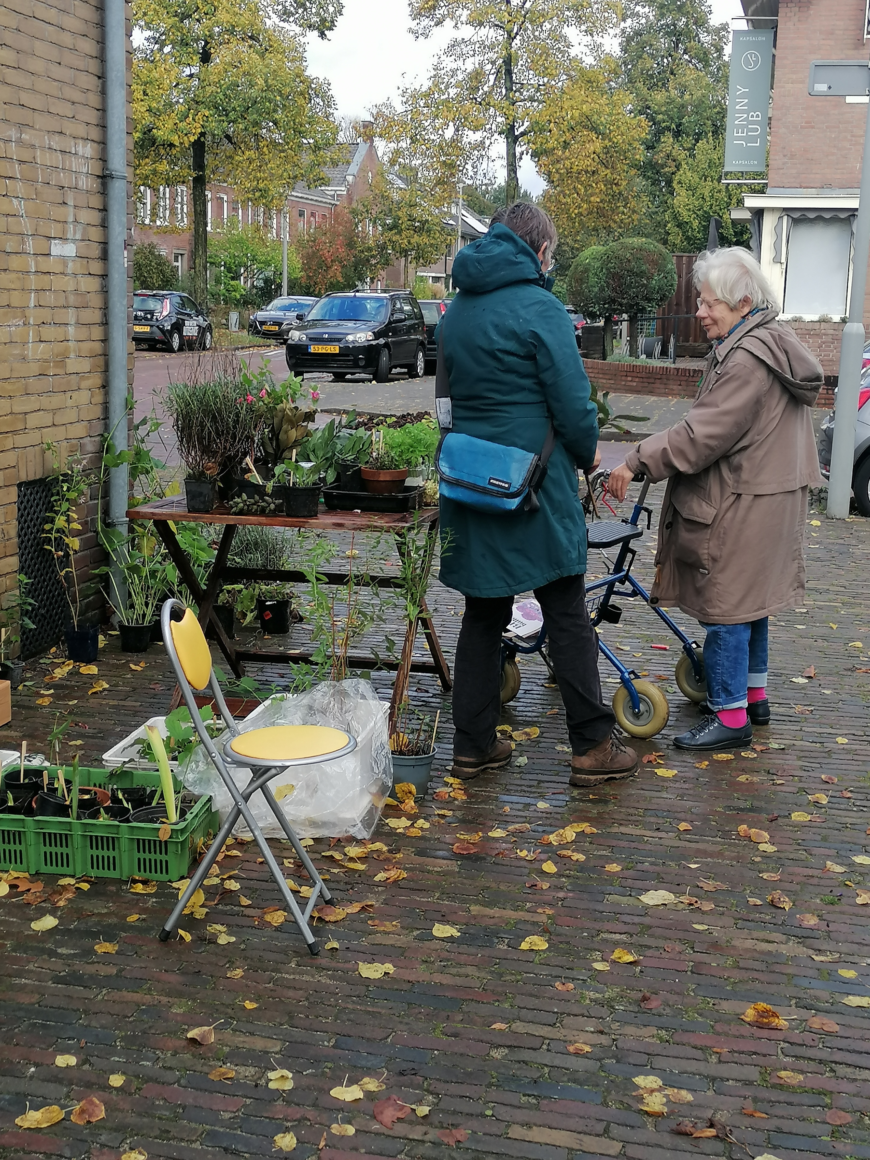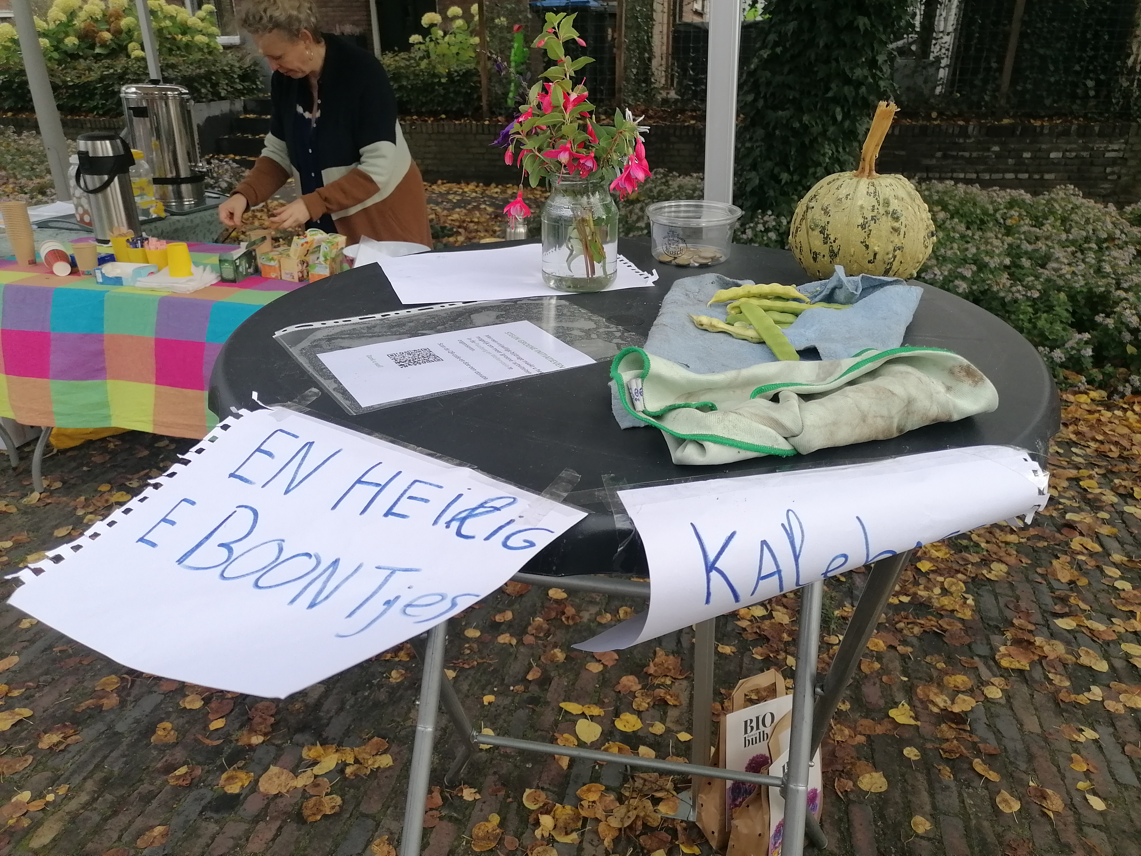 21-10-2023 - Bijna 30 wijkbewoners hebben zich tijdens de herfstmarkt opgegeven om een boomspiegel te adopteren in de wijk. Een groot succes om onze wijk nog mooier en groener te maken. Ze kregen een zakje bloembollen en kunnen gratis compost krijgen via de gemeente. De herfstmarkt op zaterdag 21 oktober begon wat aarzelend. Het eerste half uur was er door de regen bijna geen aanloop maar in de loop van de ochtend kwamen toch nog aardig wat wijkbewoners langs en lieten zich informeren door Duurzaam Paasberg, Paasberg zoemt en de Vogelwerkgroep Arnhem. En natuurlijk plantjes ruilen en kopen. Maar vooral was het erg gezellig bijpraten met een kopje koffie en de kinderen konden met herfstbladeren een egel maken.
